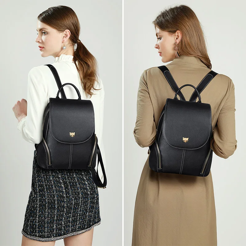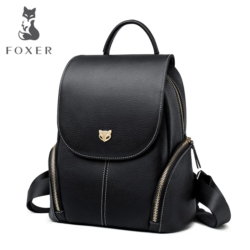 Good Price FOXER Cowhide Genuine Leather Girl's School Bag Korean Simple Black Women Backpack Large Capacity L